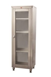 AD-209/P SINGLE DOOR STAINLESS STEEL INSTRUMENT AND MEDICINE CABINET Description: 4 adjustable shelves make up this glass front cabinet. Use: for medicine, for surgical instruments Facility: hospital Features: with shelf, 1-door Other characteristics: fixed